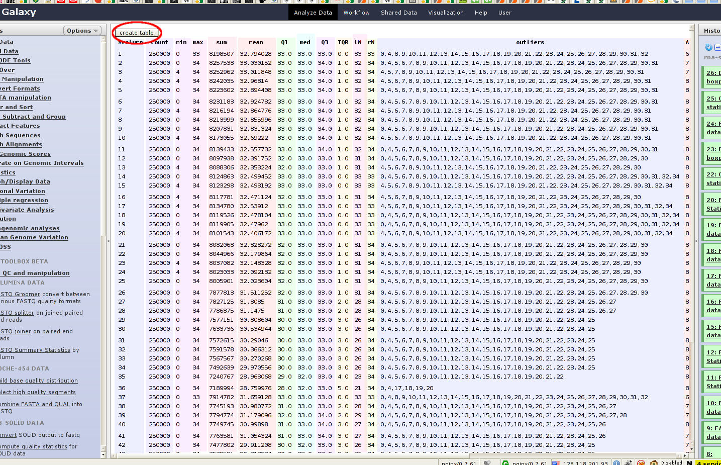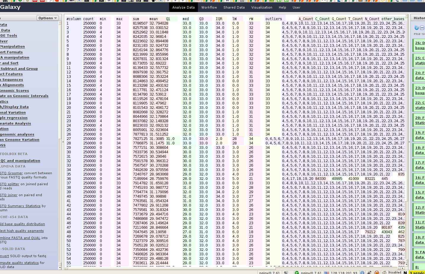 There is a great tool established to work with these resulting fastq files (this is just a small field of application): Galaxy. It is completely open source and written in Python. Those who already worked with it told me that you can easily extend it with plug-ins. You can choose wheter to run your own copy of this tool or to use the web platform of the Penn State. There’s a very huge ensemble of tools, I just worked with a small set of it, but I like it. It seems that you are able to upload unlimited size of data and it will never get deleted!? Not bad guys! You can share your data and working history and you can create workflows to automatize some jobs. Of course I’m excited to write an en- and decoder for other data like videos or music to and from fastq - let’s see if there’s some time ;-)