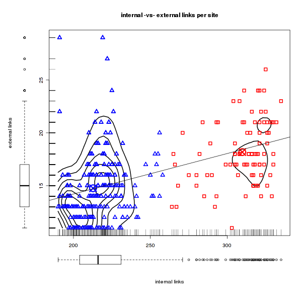 I also analyzed the outgoing links per site. I’ve clustered them with K-Means, the result can be seen in figure 1. How did I produce this graphic? Here is some R code: