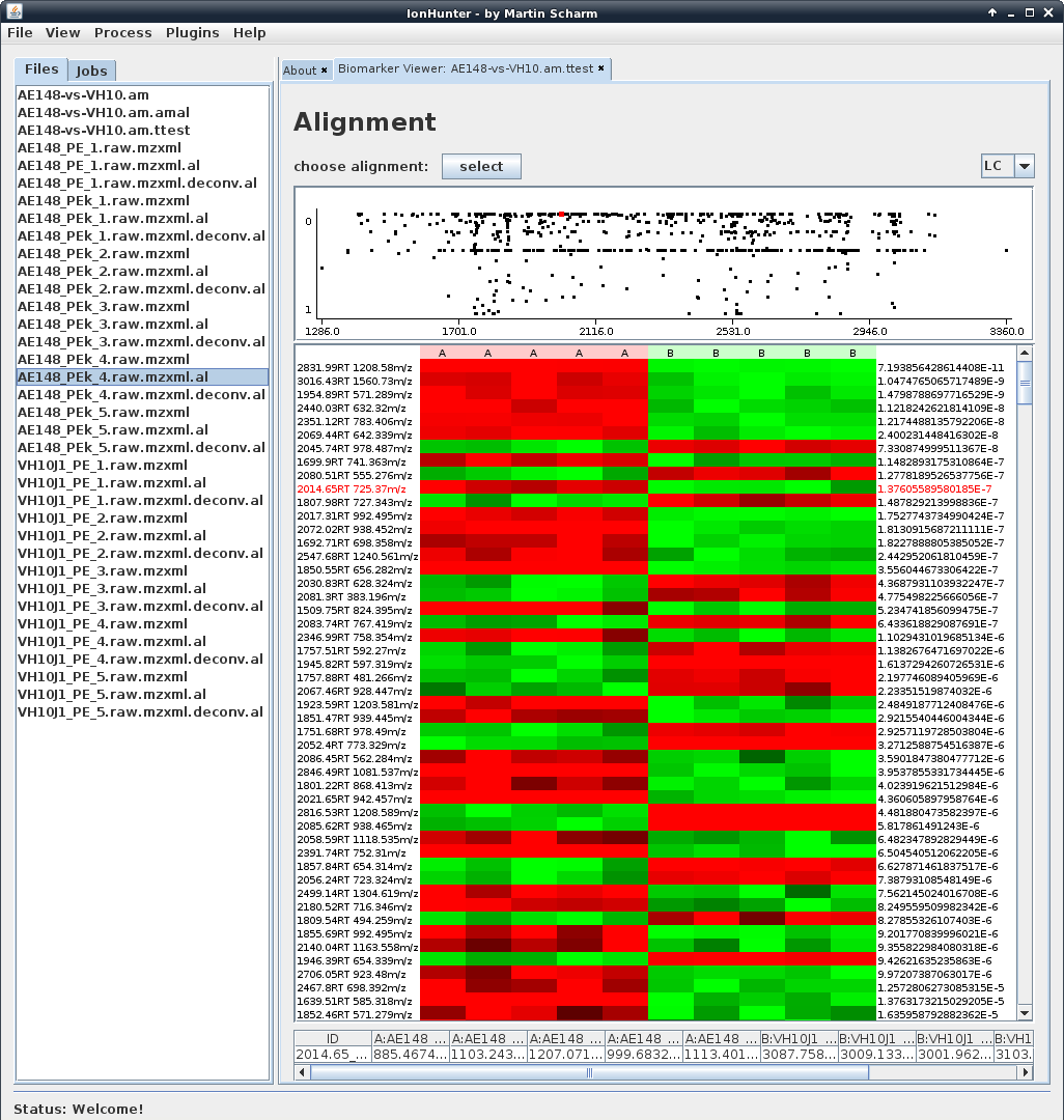 IonHunter is the tool I’m actually developing to receive one of these diplomas. It’s is a software to identify biomarkers in a huge number of LC/MS runs. IonHunter is able to preprocess mass spectrometry data, to merge multiple runs of the same sample and also to correct retention time shifts to align various experiments.
