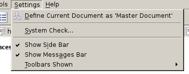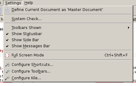 In Figure 1 you can see the menu as expected. There are some entries to Configure Kile, t0 Configure Toolbars, to Configure Shortcuts and to switch to Full Screen Mode, etc. However, as soon as I update certain things in the user interface (UI), eg. if I add a new action icon to the toolbar to quickly get the \textbf{} environment for bold fonts, these entries get lost. In those cases Kile won’t be configureable anymore. The resulting toolbar is shown in Figure 2. You see, the number of entries significantly decreased..