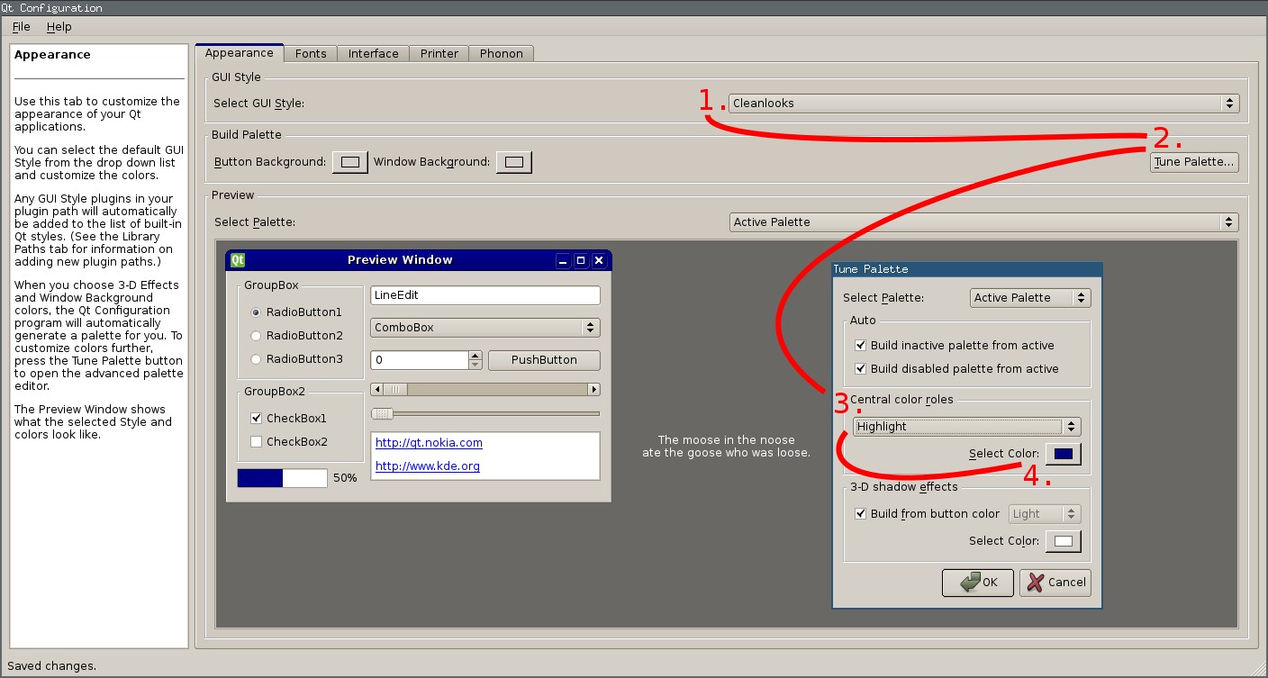 aptitude install qt4-qtconfigWhen you run qt4-qtconfig a window will pop up, as you can see in the figure on the right: