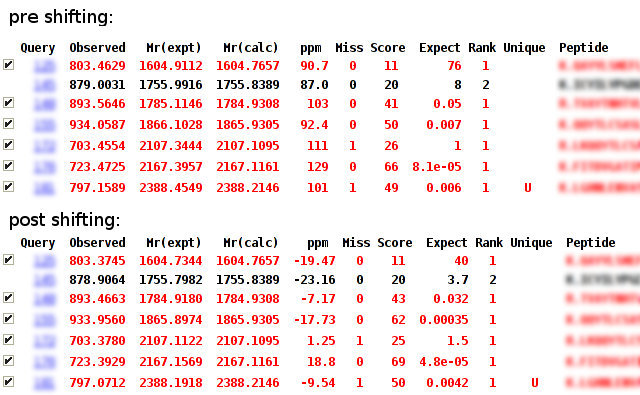 Figure 2 displays a result of a Mascot search before and after shifting of a spectrum. As you can see all scores increase more or less while the expects decrease, denoting a more secure hit.