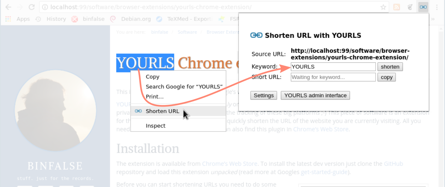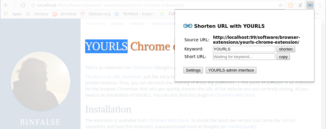 YOURLS is an URL shortener, just like bit.ly or goo.gl, but it’s open source and so you’re able to install your own private instance. Thus, you can diminish the tracking of these big platforms ;-) This piece of software is an extension for the browser Chromium that let’s you quickly shorten the URL of the website you are currently visiting. All you need is an installation of YOURLS. You can also find this plugin in Chrome’s Web Store.